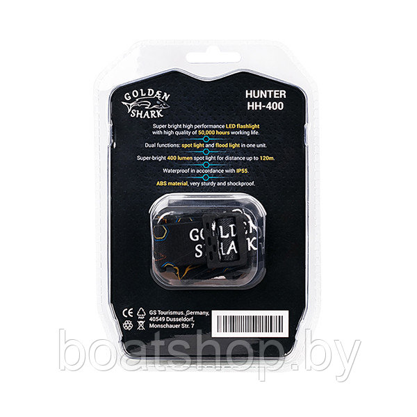 Golden Shark Hunter - это яркий и практичный налобный фонарь. Пыле- и влагозащищенный корпус. Современный диод от американской компании CREE сочетает в себе высокую яркость и продолжительное время работы. Модель имеет 2 уровня постоянного света, режим стробоскопа, сигнал SOS и 2 режима ближнего света. Включение фонаря можно производить с помощью кнопок или из режима "сенсор"- достаточно просто провести рукой в 15 см от фонаря. Питание от трех батареек или аккумуляторов типа ААА. Европейский сертификат качества.